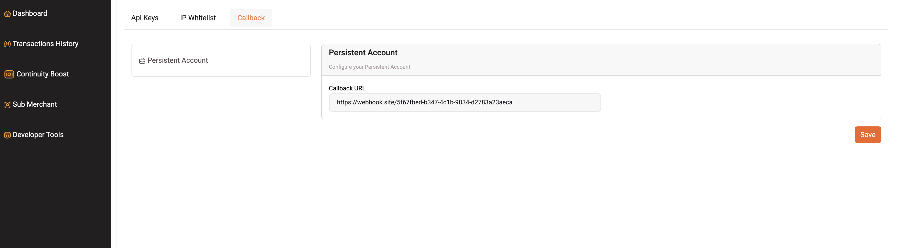 Dashboard > Developer Tools > Callback > Persistent Account